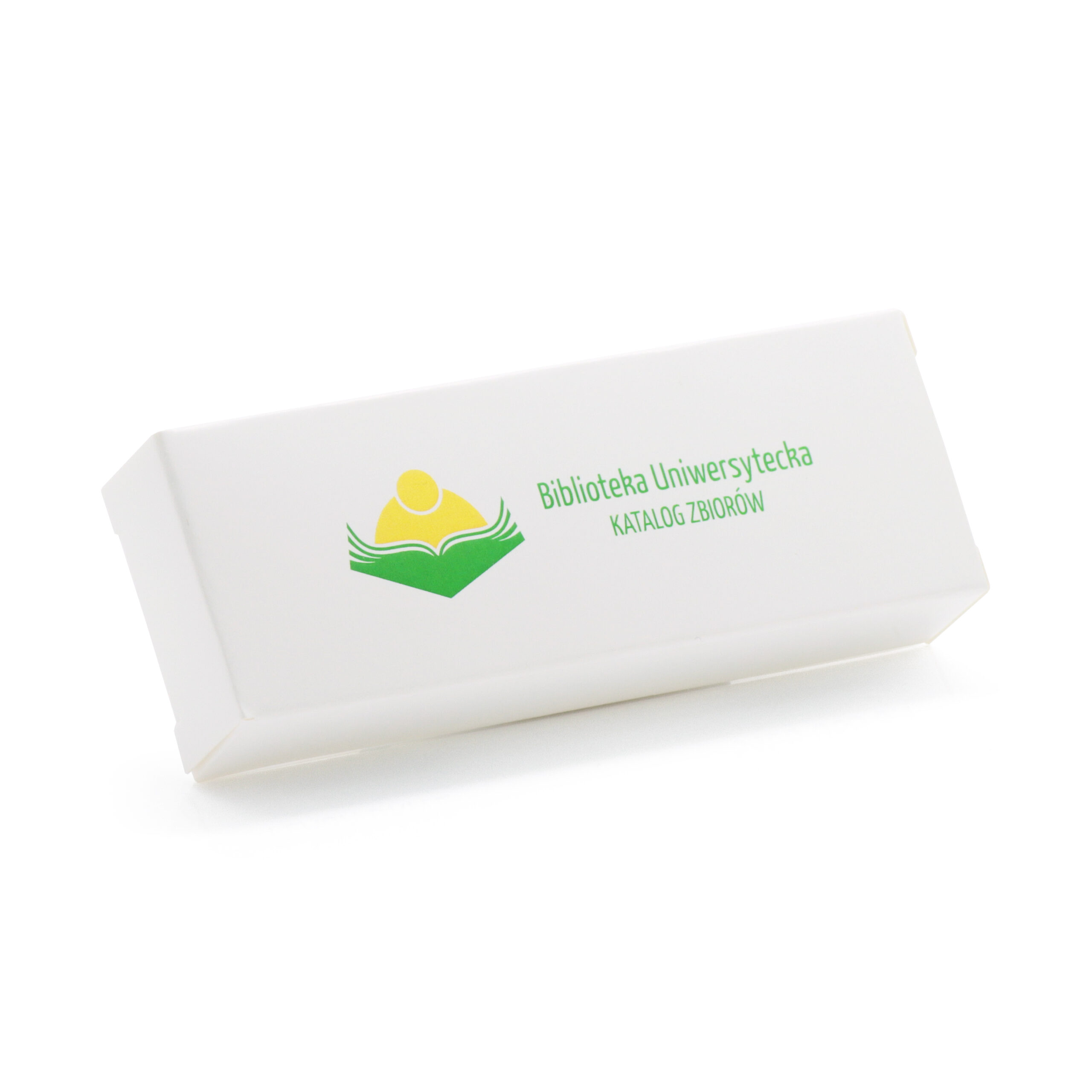Wysokiej jakości, kartonowe pudełko ze zdejmowanym wieczkiem, z opcją nadruku cyfrowego full-color na całej powierzchni. Możliwość opakowania pamięci USB w pudełko z własną grafiką, sprawi, że upominek będzie niepowtarzalny i na długo zapadnie w pamięci obdarowanego. Posiada wkładkę zabezpieczającą przed przesuwaniem zawartości.